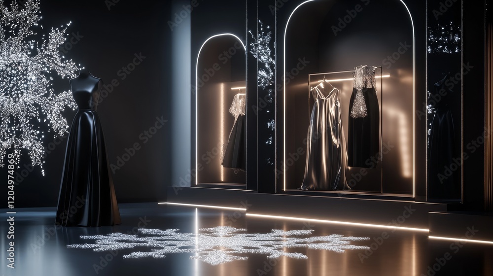 A high-end boutique showcasing monochromatic black and silve Wallpaper