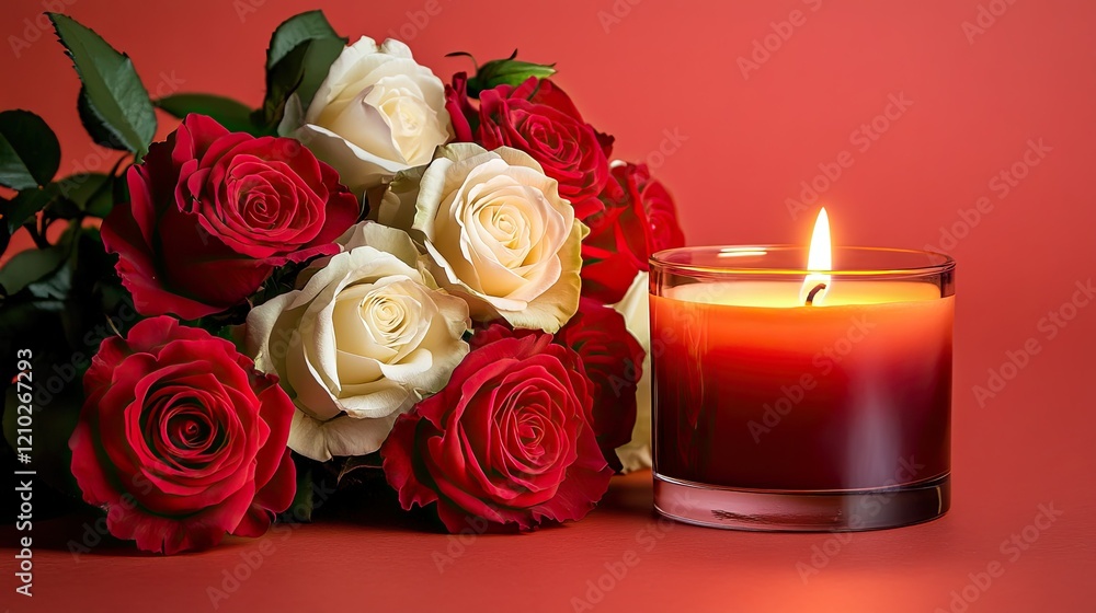 Serene arrangement of red and white roses next to a lit cand Wallpaper