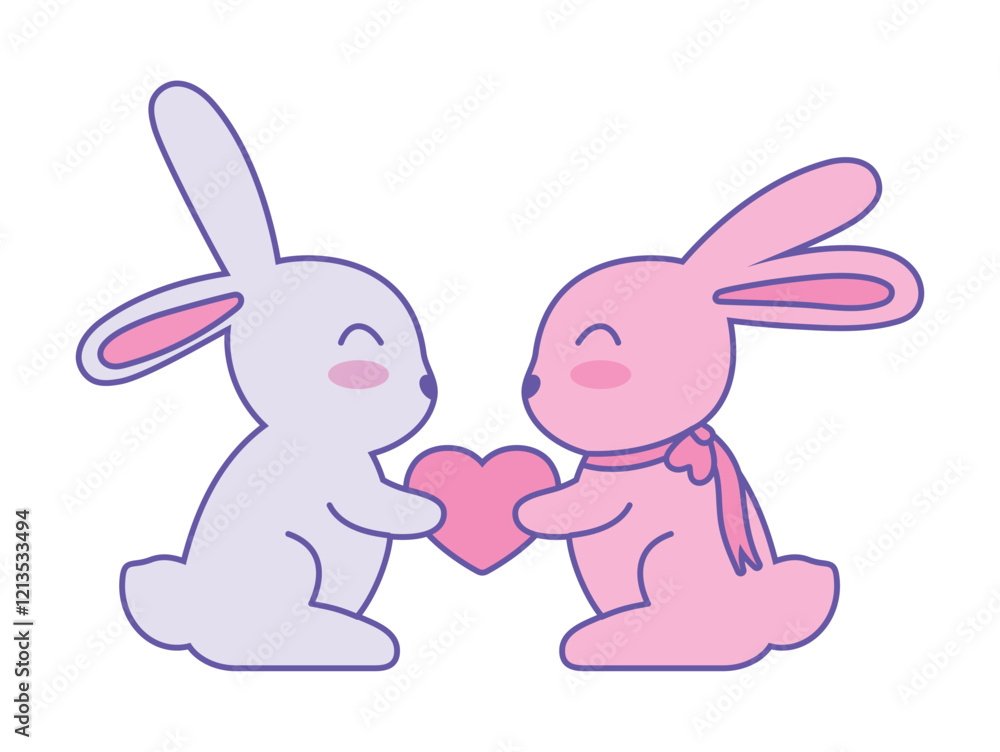 Two adorable rabbits share a gentle kiss in a cute cartoon illustration.