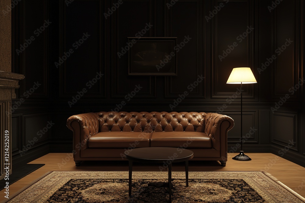 Brown Leather Chesterfield Sofa Against Dark Blue Wall