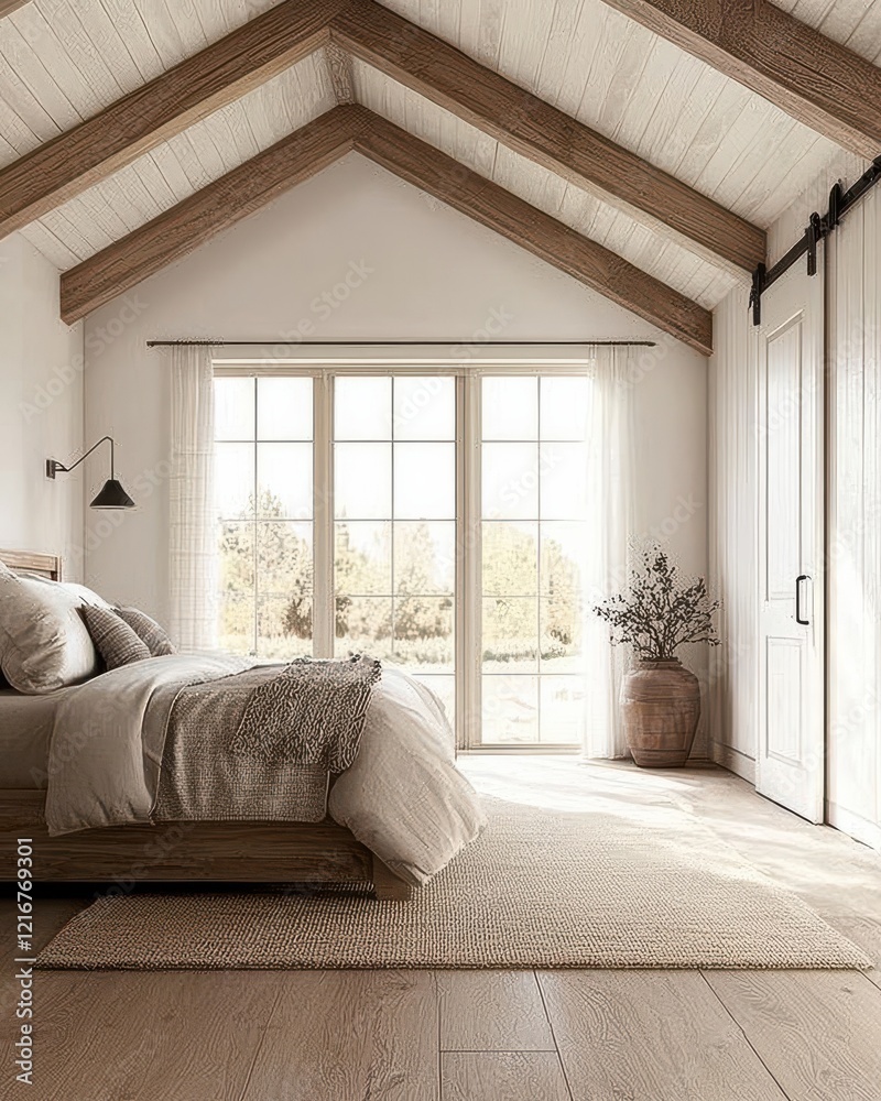 A Cozy Modern Bedroom Featuring A Rustic Ceiling Wallpaper Mural - Decorly Solutions | Decorly Solutions
