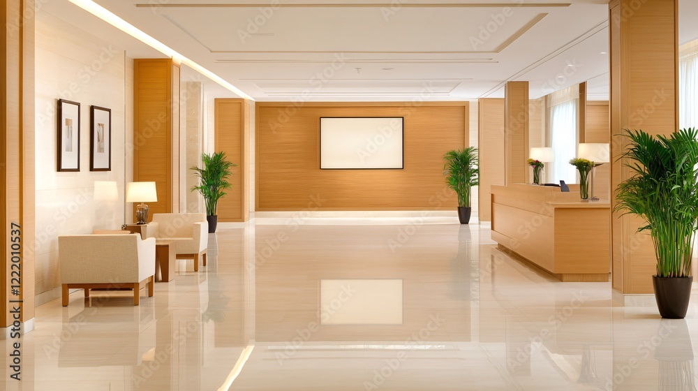 A modern well-lit lobby featuring wooden accents potted plan Wallpaper