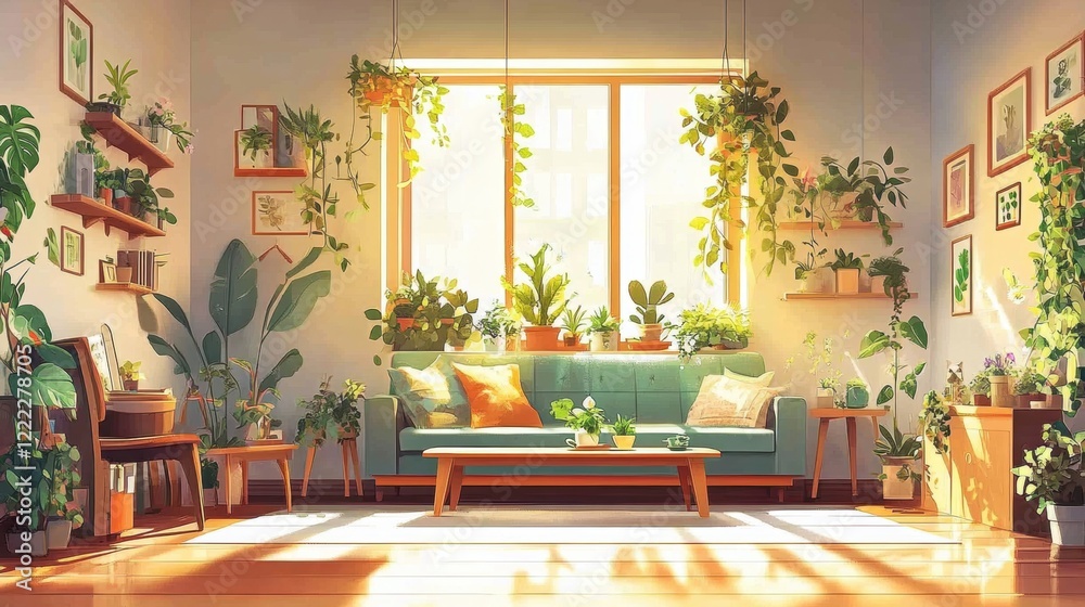 Cozy Green Living Room with Abundant Indoor Plants and Sunli Wallpaper
