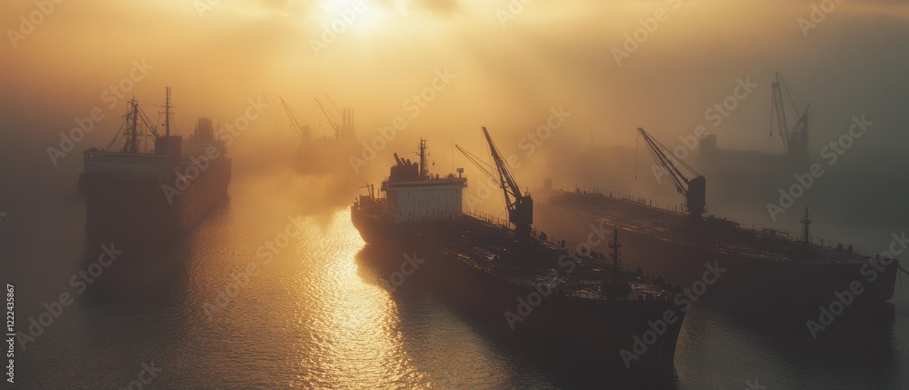 Foggy Sunrise Over A Busy Port With Ships And Industrial Activity.