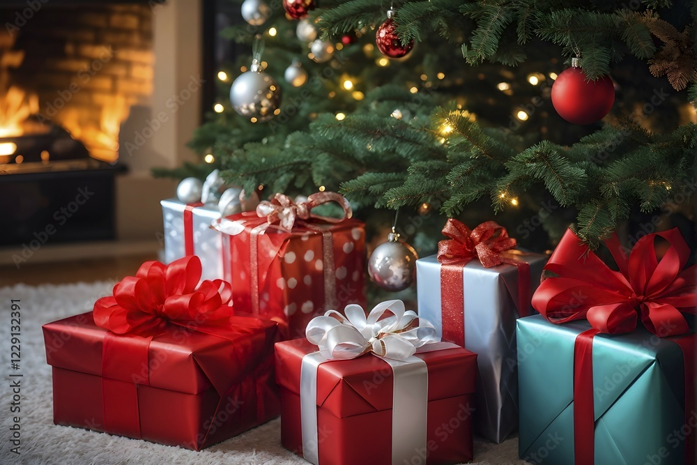 Abstract illustration of wrapped Christmas gifts, shiny ribbons and bows, stacked under a evergreen tree in a cozy living room, AI generated
