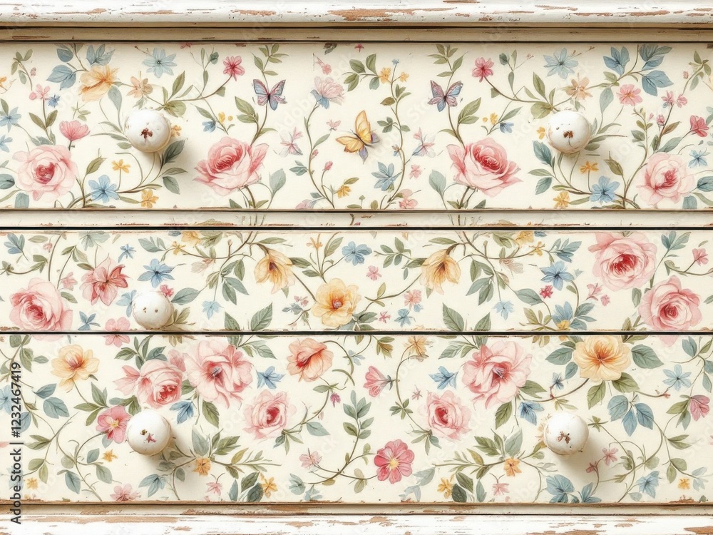 Vintage Floral Drawer Dresser with Butterfly and Rose Patter Wallpaper