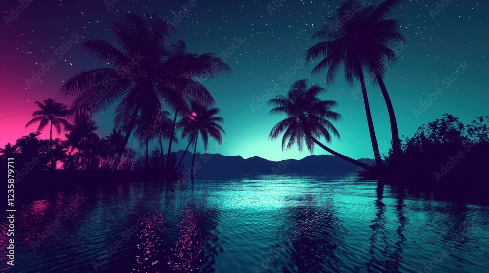 Palm Trees Silhouettes Reflecting on Water Under a Starry Night Sky