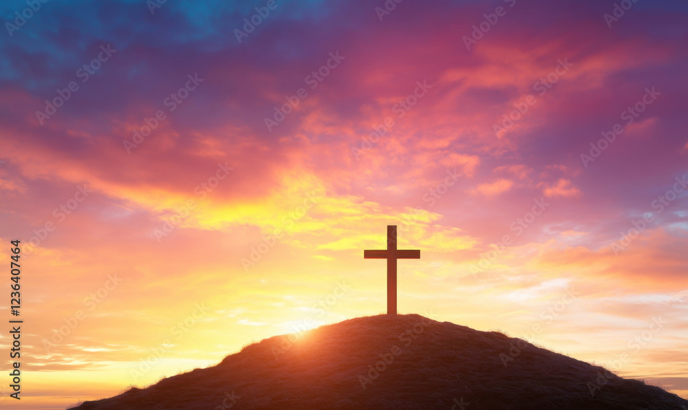 Wooden Cross Atop Hill During Stunning Sunset With Wallpaper Mural - Decorly Solutions | Decorly Solutions