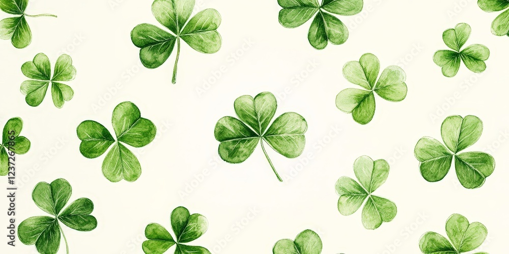 A seamless watercolor shamrock pattern on a white background. Ideal for festive decorations, St. Patrick's Day, and Irish-themed designs.