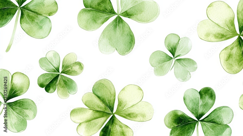 A seamless pattern of watercolor-style green clovers on a white background. Perfect for St. Patrick's Day designs, festive prints, wallpapers, and digital art.
