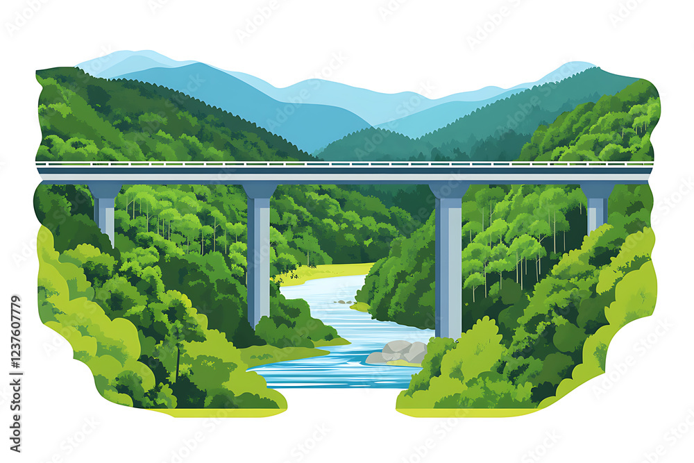 A Flat Vector Illustration Of A Large Bridge Spanning A River, Featuring Modern Architecture And Urban Landscape
