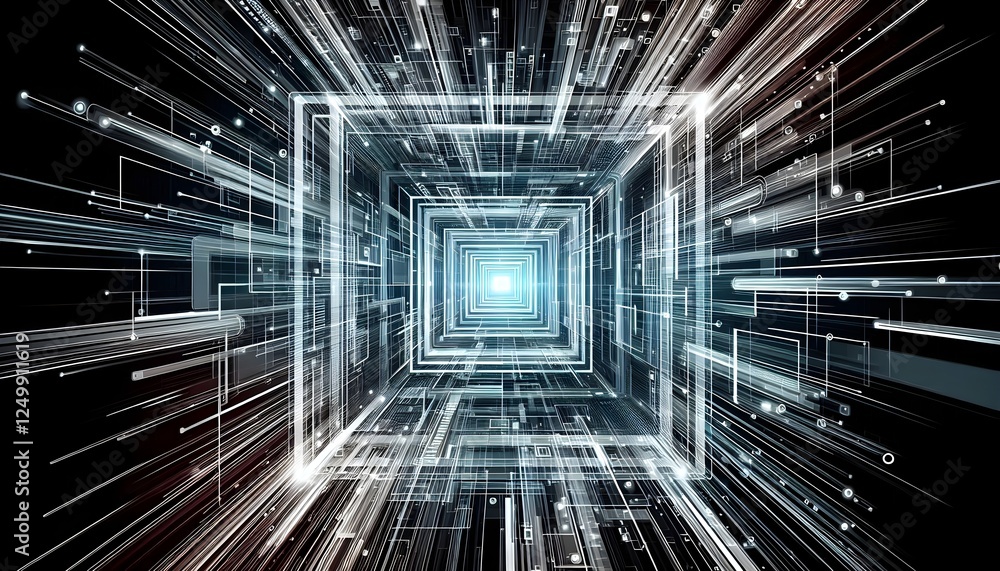 Futuristic digital tunnel with glowing lines and particles creating sense of speed and motion. vibrant blue and white colors enhance dynamic atmosphere