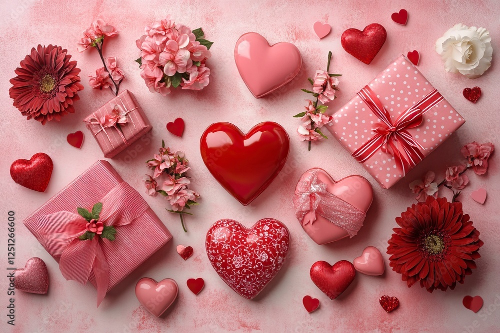 Vibrant Collection of Red and Pink Hearts Surrounded by Beautiful Flowers, Candies, and Decorative Elements for Romantic Celebrations and Events