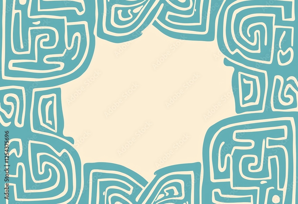 パステルブルーと白の迷路デザインポスター - ライトベージュの背景にミニマルな幾何学模様、モダンなインテリアと落ち着いた壁の芸術に