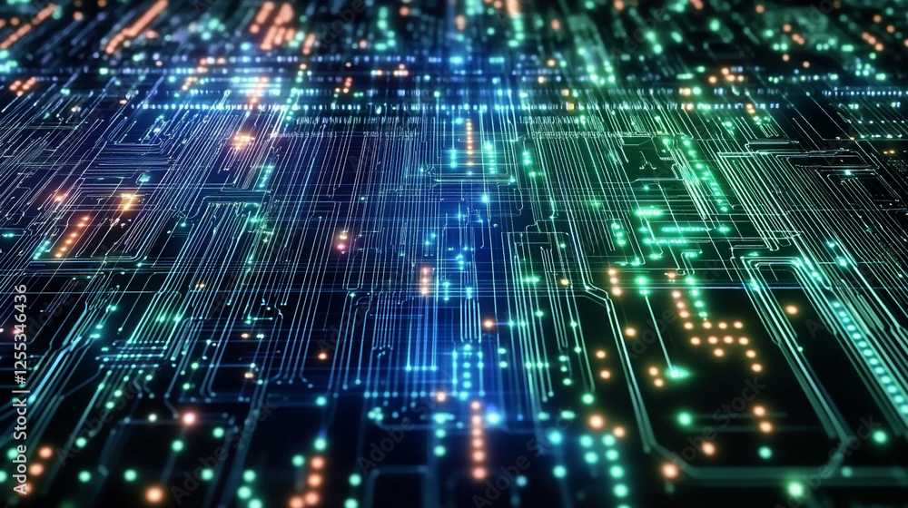 Abstract Digital Landscape with Glowing Lines and Binary Code