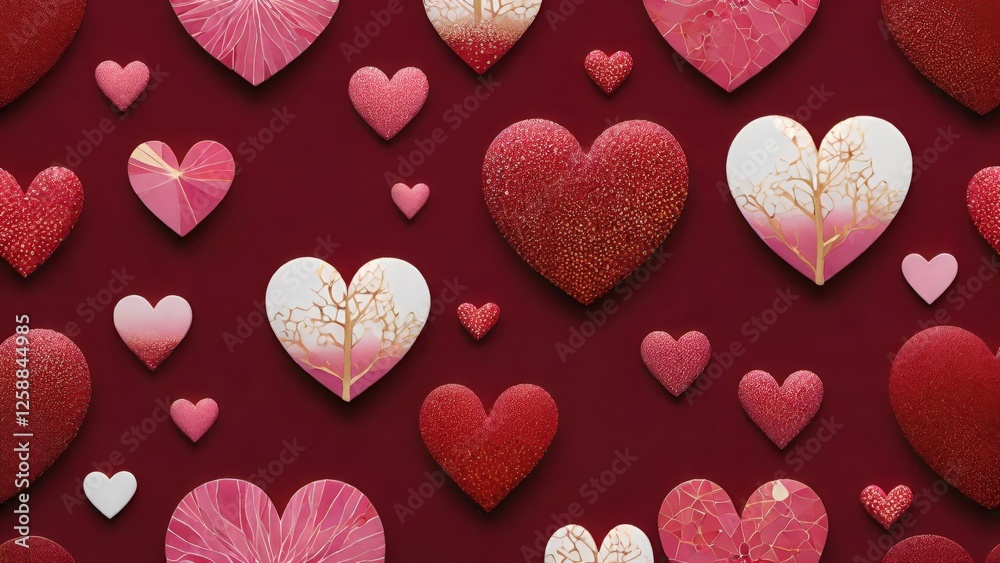 A Valentine's Day background serves as the setting for a flat lay style greeting composition showcasing a cluster of red hearts.