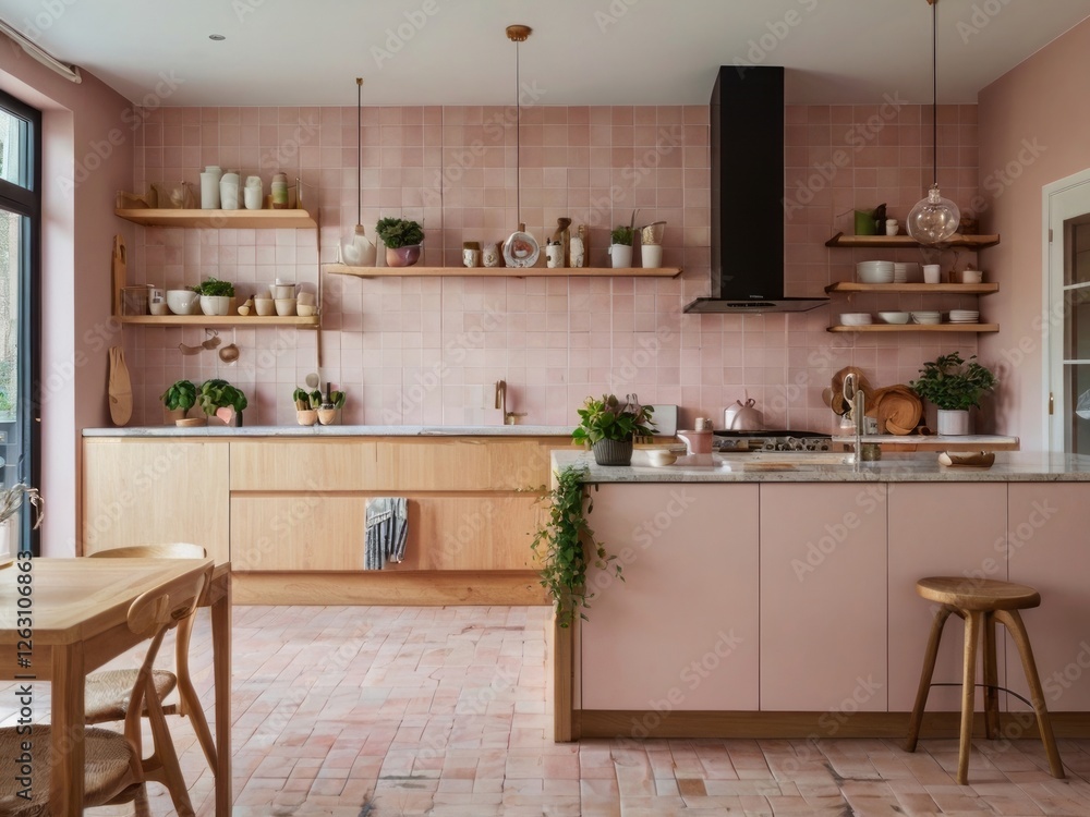 Modern Pink Kitchen With Light Wood Cabinets And Open Shelvi Wallpaper