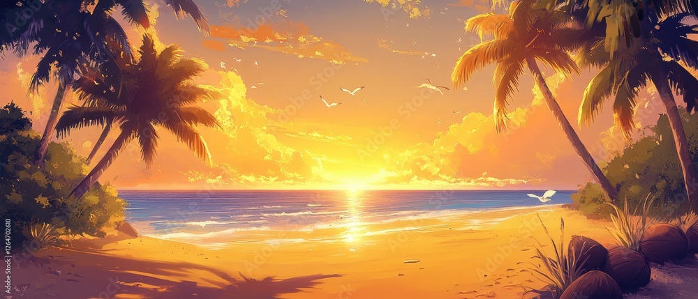 Sunset on a tranquil tropical beach with swaying palm trees and gentle ocean waves, serene, outdoor, sunset
