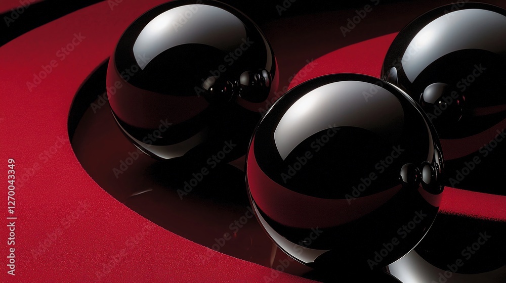 Three glossy black spheres on a red circular surface Wallpaper