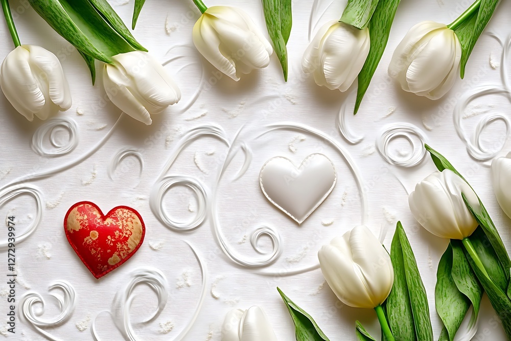Elegant Women's Day banner with filigree hearts and elegant white azaleas on a sophisticated white background.