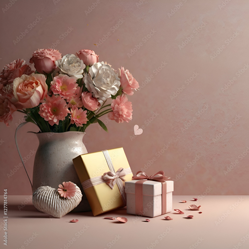A romantic bouquet of soft pink roses paired with a beautifully wrapped gift, set against a pastel pink background for a sweet, celebratory vibe.