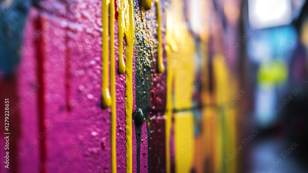 Colorful paint drips on a textured wall creating vibrant urban art in a creative space