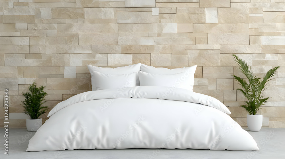 Modern Bedroom Stone Wall Plants White Bedding Minimalist Wallpaper Mural - Decorly Solutions | Decorly Solutions