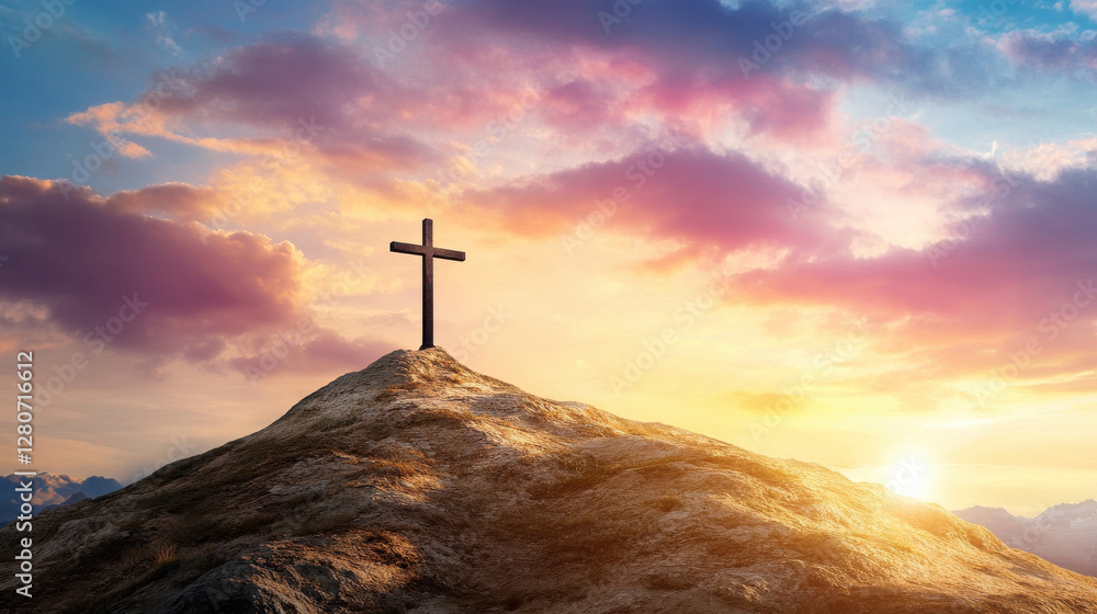 Serene Sunrise Cross on Hill, Symbolizing Faith, Hope, and Eternal Life in Christianity