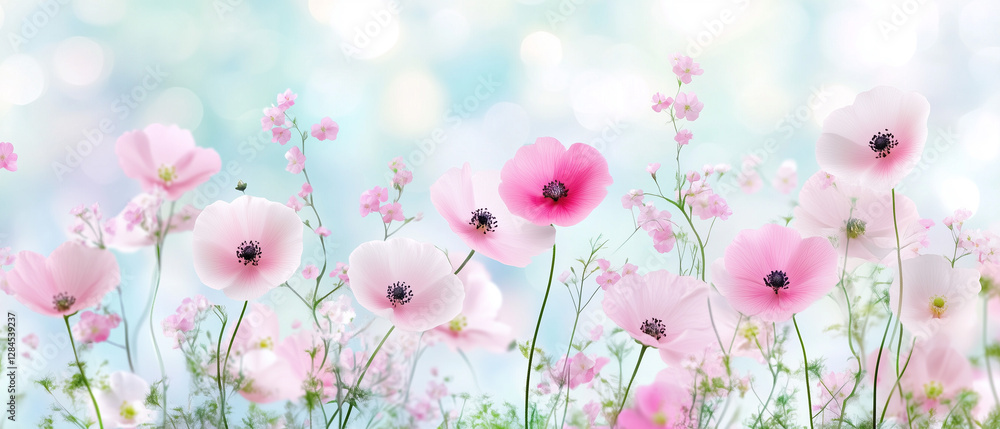 Ethereal pink sakura petals drifting in soft pastel sky with light flares. Perfect for beauty, mindfulness, wedding stationery, and spring seasonal graphics.