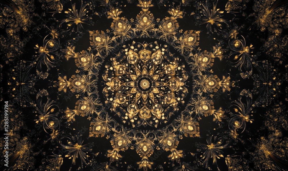 Intricate gold mandala design on black background, ornate floral patterns. Perfect for luxury, decoration, and design projects needing opulent texture.