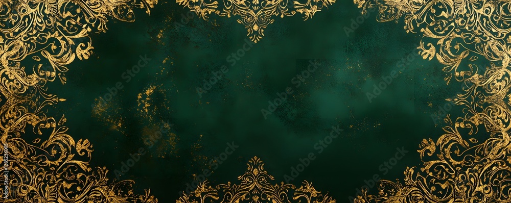 Ornate golden floral patterns frame an emerald green backdro Wallpaper