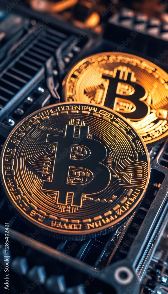 Close-up Of Gold-colored Cryptocurrency Coins On Dark Metallic Wallpaper Mural - Decorly Solutions | Decorly Solutions