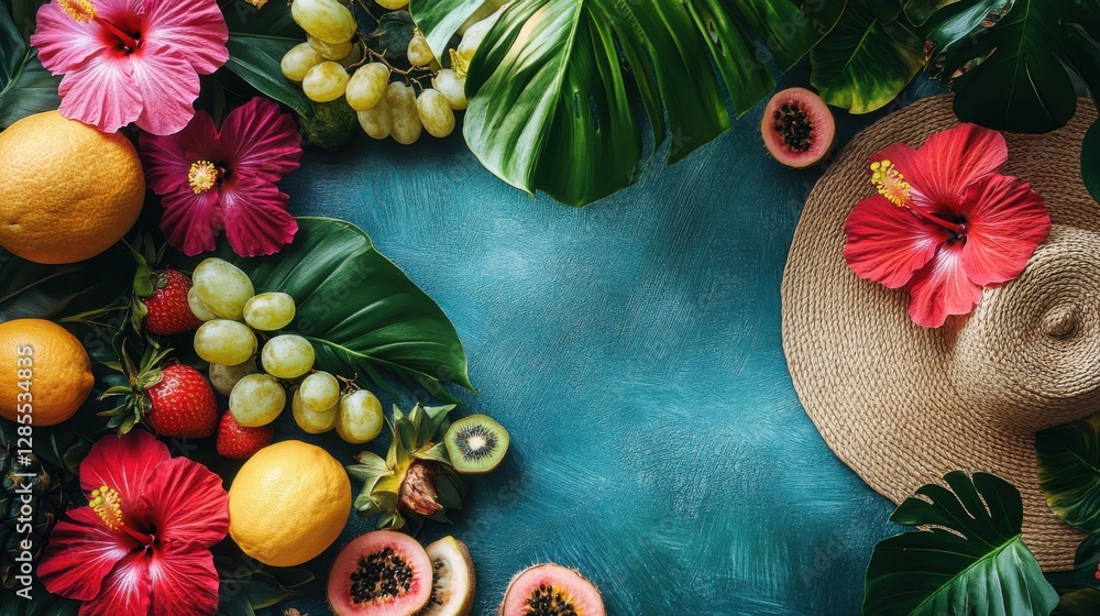 Vibrant Tropical Fruit And Hibiscus Flower Arrangement On Wallpaper Mural - Decorly Solutions | Decorly Solutions