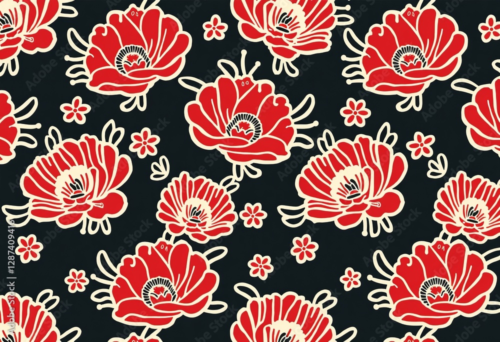 このエレガントな花柄で、日本の新年の伝統の美しさを発見してください。印象的な赤、黒、白の配色を特徴とし、木版画スタイルで。 Wallpaper Mural - Decorly Solutions | Decorly Solutions