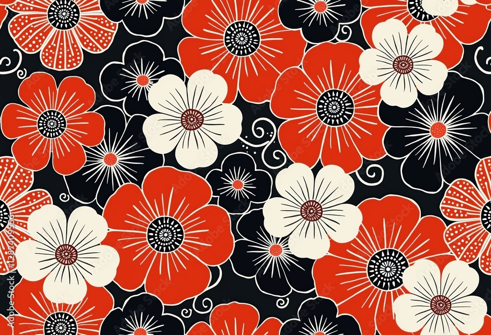 お祝いの装飾や生地のプリントに最適な、伝統的な日本の優雅さを体現する鮮やかな赤、黒、白の花柄で新年を祝いましょう。 Wallpaper Mural - Decorly Solutions | Decorly Solutions