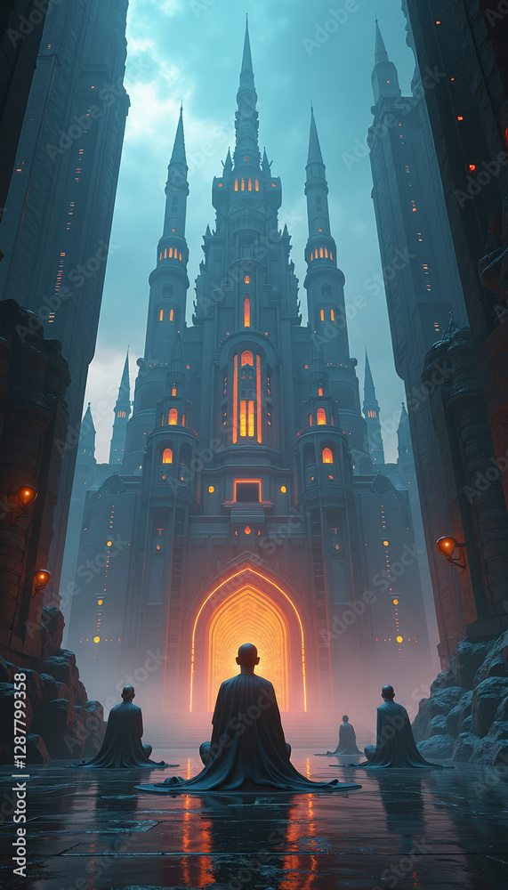 Cyber Monks Meditating In Vibrant Futuristic Castle Inner Wallpaper Mural - Decorly Solutions | Decorly Solutions