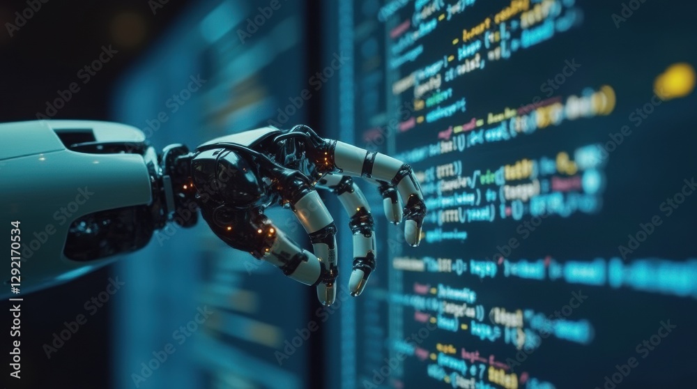AI Robot Hand Interacting with Computer Code while coding Wallpaper