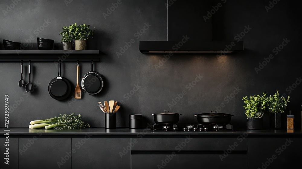 Dark Kitchen Cooking Utensils Herbs Minimalist Design Interior Wallpaper Mural - Decorly Solutions | Decorly Solutions