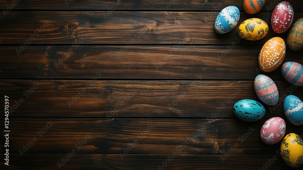 top view of a a colorful easter eggs on a wooden background with copy space
