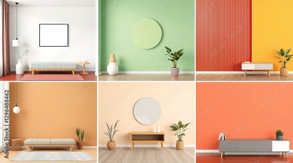 A collage showcases diverse room designs with various colored walls, furniture pieces sofas, daybeds, consoles, plants, and decor. Each scene offers a unique style and color palette.