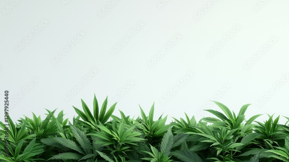 Botanical Green Canopy: A refreshing corner of vibrant green cannabis leaves nestles alongside ethereal, cloud-like formations, against an empty, softly lit backdrop.