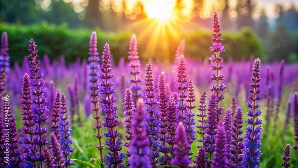 A lush flowering meadow sage plant with a vibrant purple color and delicate white flowers against a soft green grassy background, nature, landscape