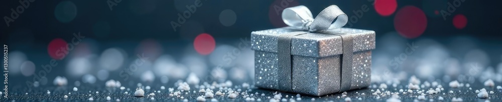 Glitter silver gift box with a sprinkle of snowflakes around Wallpaper