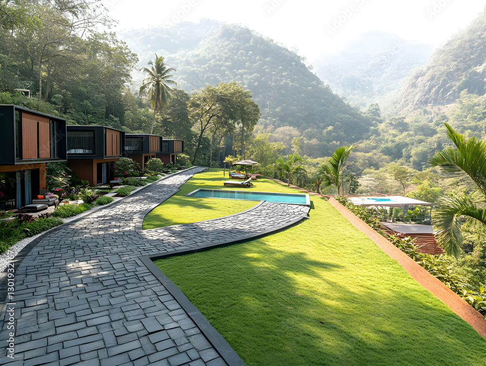 Photo Modern Resort Lush Tropical Landscape Serene Pool Tran Wallpaper
