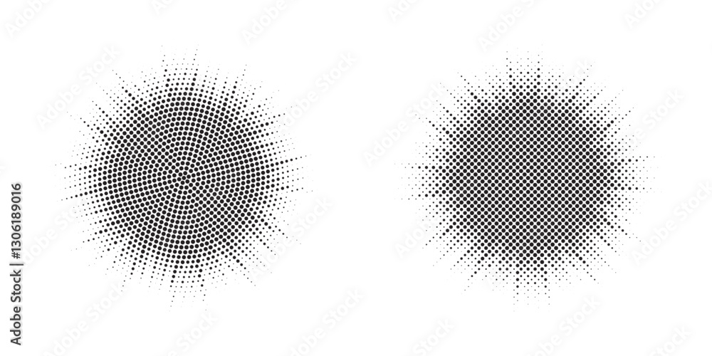 Halftone circle frame background set. Round border Icon using halftone random circle. Burst Halftone light effect. Glowing light burst. abstract grunge halftone dots background. Vector illustration.
