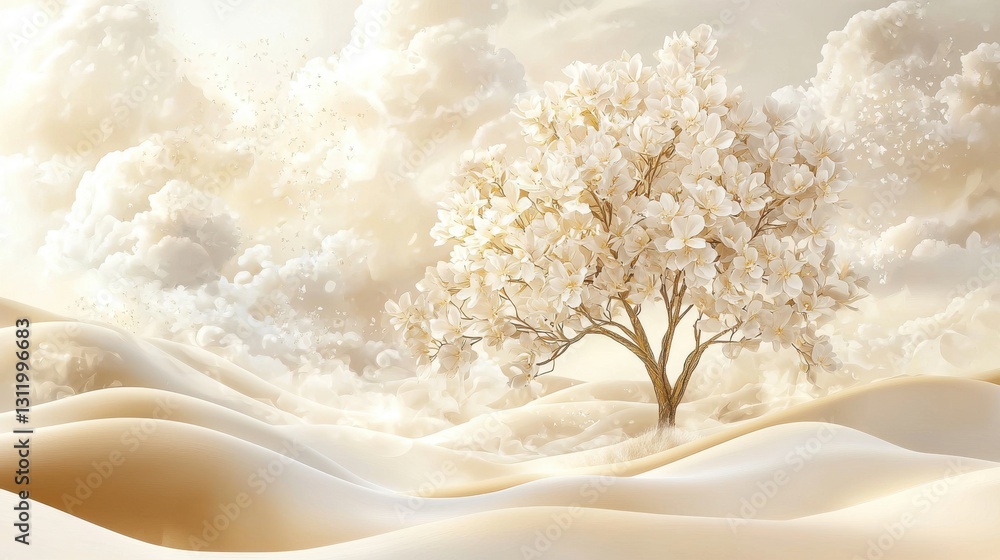 Golden Tree With White Flowers Stands Amidst Clouds Wallpaper Mural - Decorly Solutions | Decorly Solutions