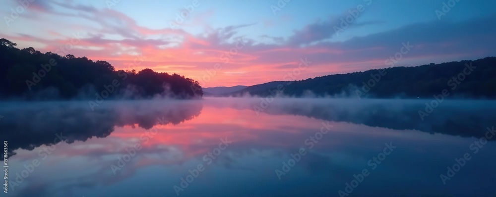 Serene sunrise over a tranquil lake, mist rising, conveying a sense of peaceful spiritual energy and inner calm Perfect for meditation, yoga, or mindfulness themes , quiet, mystical, yoga