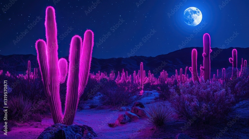 Surreal Neon Cactus Landscape Under Full Moon At Wallpaper Mural - Decorly Solutions | Decorly Solutions