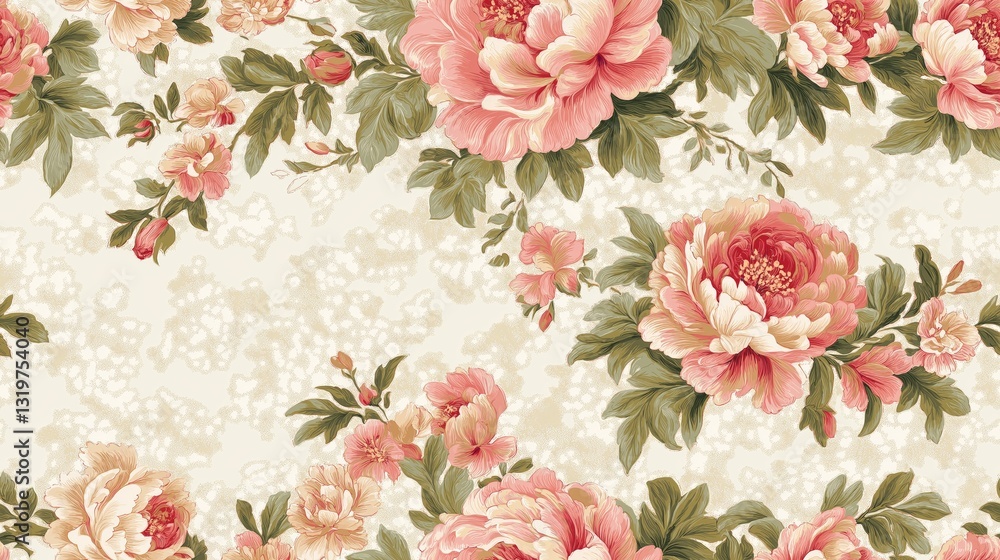 Vintage Floral Pattern with Peony Flowers and Green Leaves o Wallpaper