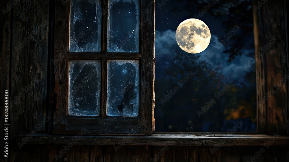 A serene night view through a window, featuring a glowing full moon illuminating a quiet room atmosphere